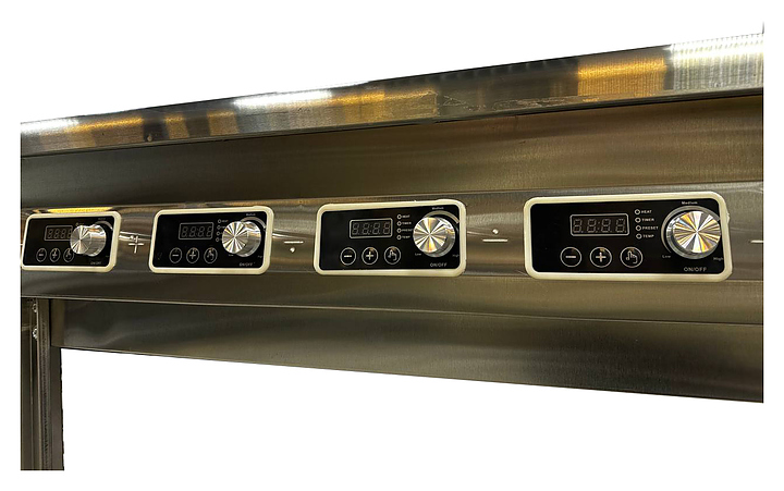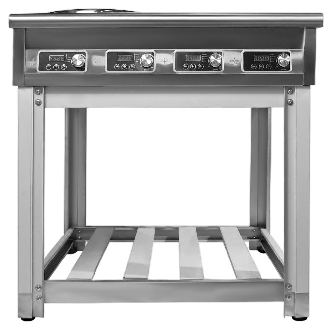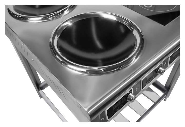 Индукционная плита OBOD Комби WOK предназначена для приготовления большого ассортимента блюд на предприятиях пищевой промышленности, общественного питания и торговли. Принцип работы основан на непосредственном нагреве металлической посуды создаваемыми высокочастотным магнитным полем индуцированными вихревыми токами. Модель оснащена 4 независимыми варочными зонами: 2 WOK в виде полусферических чаш с выпуклой кромкой и 2 с гладкой рабочей поверхностью, открытой подставкой и расположенной на наклонной фронтальной стенке электромеханической панелью управления. Корпус выполнен из нержавеющей стали, гладкая рабочая поверхность – из стеклокерамики. Особенности: