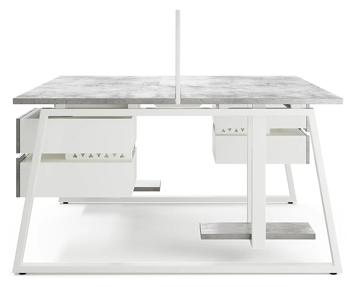 Офисный стол Кобор TR/2-160/140 white/chicago на 2 рабочих места используется в офисных помещениях и кабинетах руководителей. Модель оснащена опорами в форме трапеции. Каркас и опоры выполнены из металла, выкрашенного в цвет белый муар (RAL9016), столешница – из ламинированной древесно-стружечной плиты (ЛДСП) цвета бетон чикаго (F186 ST9). Дополнительные характеристики: