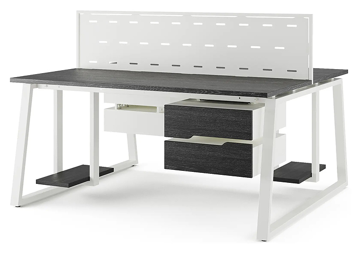 Офисный стол Кобор TR/2-80/160 white/glazed на 2 рабочих места используется в офисных помещениях и кабинетах руководителей. Модель оснащена опорами в форме трапеции. Каркас и опоры выполнены из металла, выкрашенного в цвет белый муар (RAL9016), столешница – из ламинированной древесно-стружечной плиты (ЛДСП) цвета черный дуб (H3178 ST37). Дополнительные характеристики: