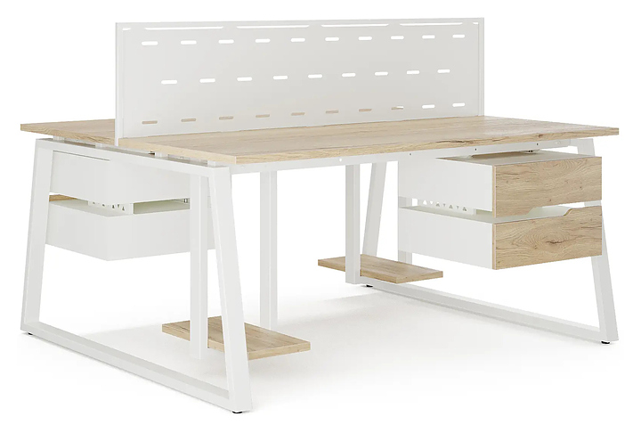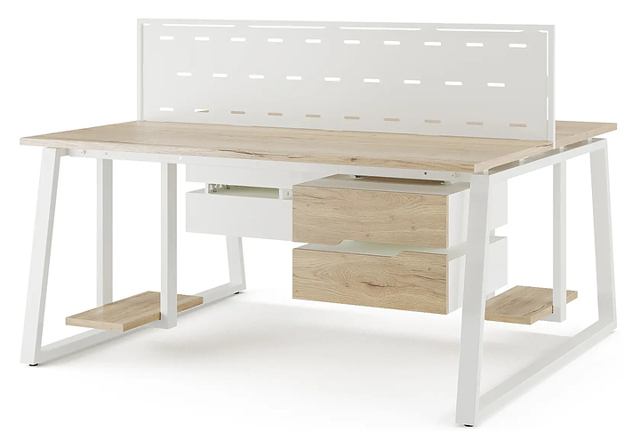 Офисный стол Кобор TR/2-140/140 white/natural на 2 рабочих места используется в офисных помещениях и кабинетах руководителей. Модель оснащена опорами в форме трапеции. Каркас и опоры выполнены из металла, выкрашенного в цвет белый муар (RAL9016), столешница – из ламинированной древесно-стружечной плиты (ЛДСП) цвета натуральный дуб (H1180 ST37). Дополнительные характеристики: