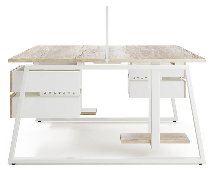Офисный стол Кобор TR/2-140/160 white/natural на 2 рабочих места используется в офисных помещениях и кабинетах руководителей. Модель оснащена опорами в форме трапеции. Каркас и опоры выполнены из металла, выкрашенного в цвет белый муар (RAL9016), столешница – из ламинированной древесно-стружечной плиты (ЛДСП) цвета натуральный дуб (H1180 ST37). Дополнительные характеристики: