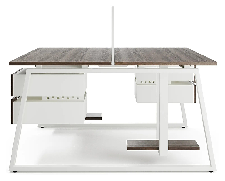 Офисный стол Кобор TR/2-160/120 white/charlston на 2 рабочих места используется в офисных помещениях и кабинетах руководителей. Модель оснащена опорами в форме трапеции. Каркас и опоры выполнены из металла, выкрашенного в цвет белый муар (RAL9016), столешница – из ламинированной древесно-стружечной плиты (ЛДСП) цвета дуб чарльстон (H3154 ST36). Дополнительные характеристики: