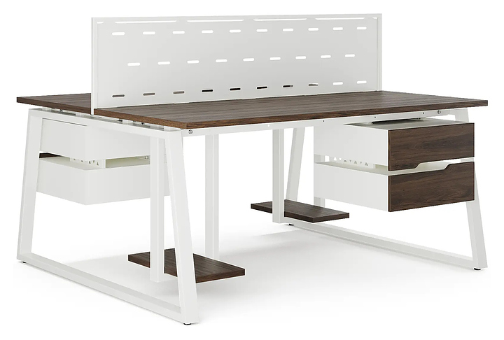 Офисный стол Кобор TR/2-120/160 white/charlston на 2 рабочих места используется в офисных помещениях и кабинетах руководителей. Модель оснащена опорами в форме трапеции. Каркас и опоры выполнены из металла, выкрашенного в цвет белый муар (RAL9016), столешница – из ламинированной древесно-стружечной плиты (ЛДСП) цвета дуб чарльстон (H3154 ST36). Дополнительные характеристики: