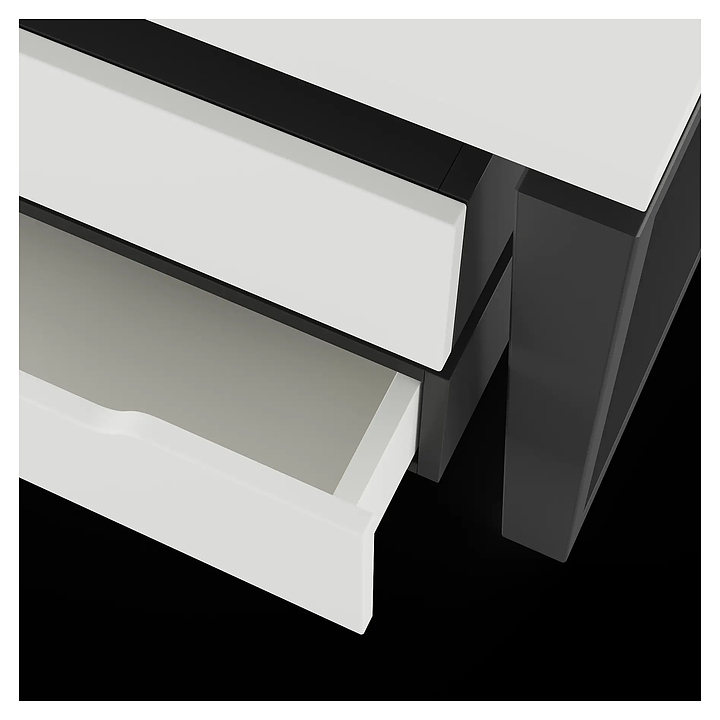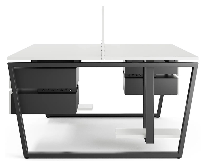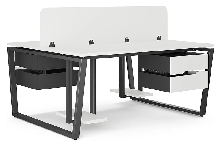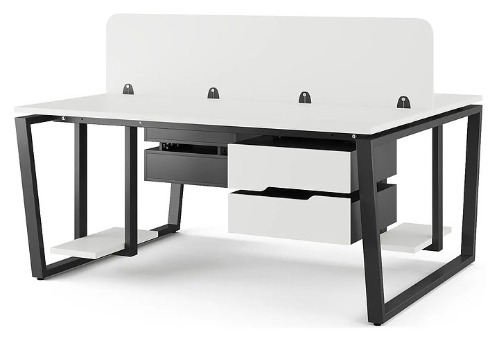 Офисный стол Кобор OTR/2-80/120 black/premium на 2 рабочих места используется в офисных помещениях и кабинетах руководителей. Модель оснащена опорами в форме обратной трапеции. Каркас и опоры выполнены из металла, выкрашенного в цвет черный муар (RAL9005), столешница – из ламинированной древесно-стружечной плиты (ЛДСП) цвета белый премиум (W1000 ST9). Дополнительные характеристики: