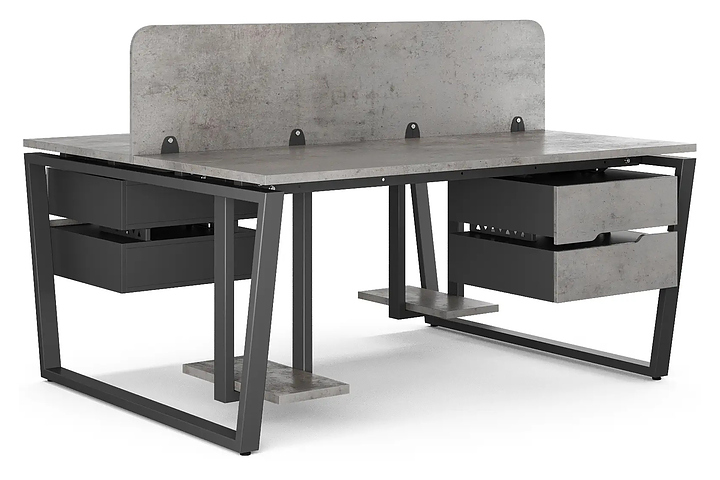 Офисный стол Кобор OTR/2-80/160 black/chicago на 2 рабочих места используется в офисных помещениях и кабинетах руководителей. Модель оснащена опорами в форме обратной трапеции. Каркас и опоры выполнены из металла, выкрашенного в цвет черный муар (RAL9005), столешница – из ламинированной древесно-стружечной плиты (ЛДСП) цвета бетон чикаго (F186 ST9). Дополнительные характеристики: