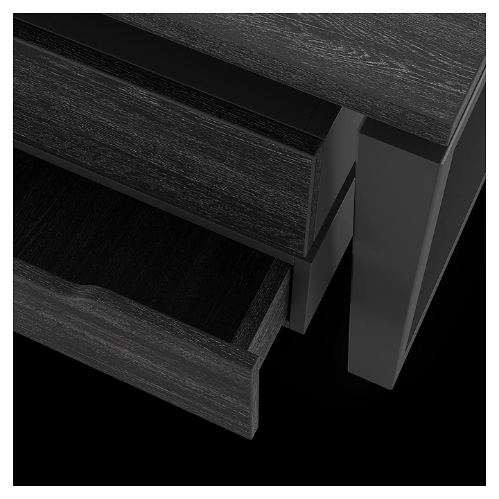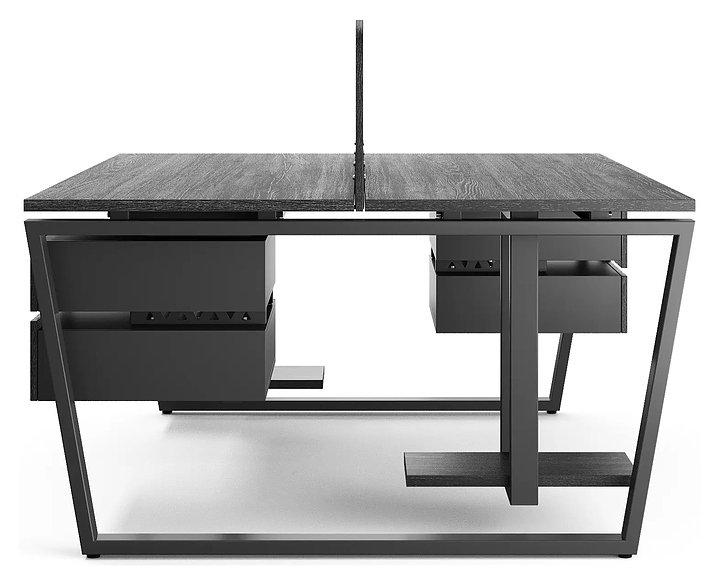 Офисный стол Кобор OTR/2-160/140 black/glazed на 2 рабочих места используется в офисных помещениях и кабинетах руководителей. Модель оснащена опорами в форме обратной трапеции. Каркас и опоры выполнены из металла, выкрашенного в цвет черный муар (RAL9005), столешница – из ламинированной древесно-стружечной плиты (ЛДСП) цвета черный дуб (H3178 ST37). Дополнительные характеристики: