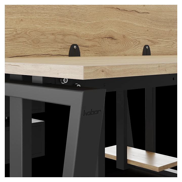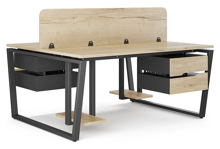 Офисный стол Кобор OTR/2-180/160 black/natural на 2 рабочих места используется в офисных помещениях и кабинетах руководителей. Модель оснащена опорами в форме обратной трапеции. Каркас и опоры выполнены из металла, выкрашенного в цвет черный муар (RAL9005), столешница – из ламинированной древесно-стружечной плиты (ЛДСП) цвета натуральный дуб (H1180 ST37). Дополнительные характеристики: