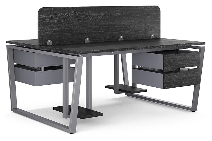 Офисный стол Кобор OTR/2-100/140 graphite/glazed на 2 рабочих места используется в офисных помещениях и кабинетах руководителей. Модель оснащена опорами в форме обратной трапеции. Каркас и опоры выполнены из металла, выкрашенного в цвет графит муар (RAL7024), столешница – из ламинированной древесно-стружечной плиты (ЛДСП) цвета черный дуб (H3178 ST37). Дополнительные характеристики: