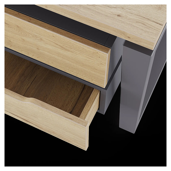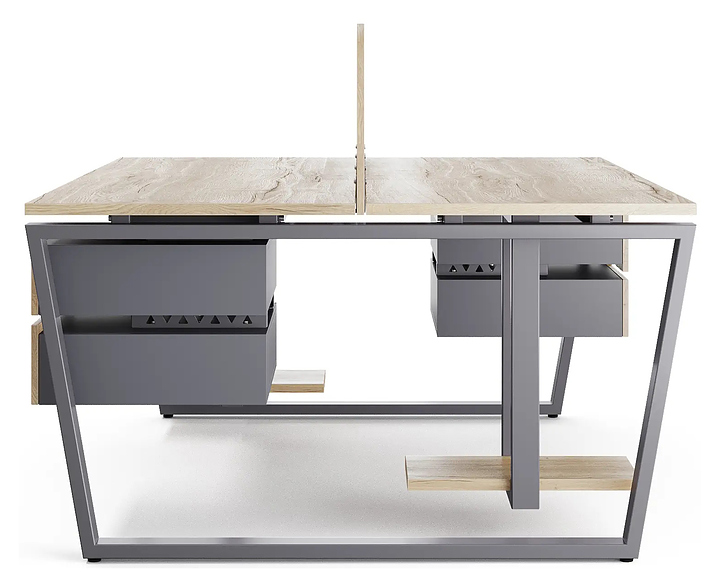 Офисный стол Кобор OTR/2-140/140 graphite/natural на 2 рабочих места используется в офисных помещениях и кабинетах руководителей. Модель оснащена опорами в форме обратной трапеции. Каркас и опоры выполнены из металла, выкрашенного в цвет графит муар (RAL7024), столешница – из ламинированной древесно-стружечной плиты (ЛДСП) цвета натуральный дуб (H1180 ST37). Дополнительные характеристики:
