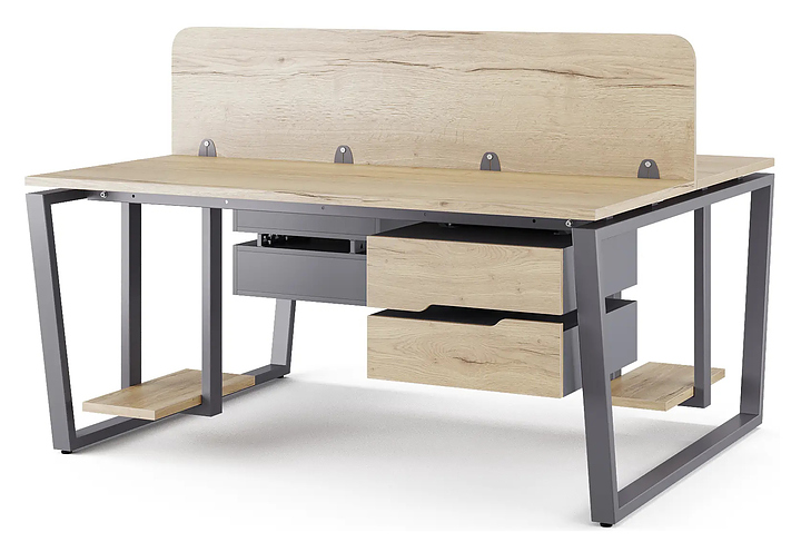 Офисный стол Кобор OTR/2-160/140 graphite/natural на 2 рабочих места используется в офисных помещениях и кабинетах руководителей. Модель оснащена опорами в форме обратной трапеции. Каркас и опоры выполнены из металла, выкрашенного в цвет графит муар (RAL7024), столешница – из ламинированной древесно-стружечной плиты (ЛДСП) цвета натуральный дуб (H1180 ST37). Дополнительные характеристики: