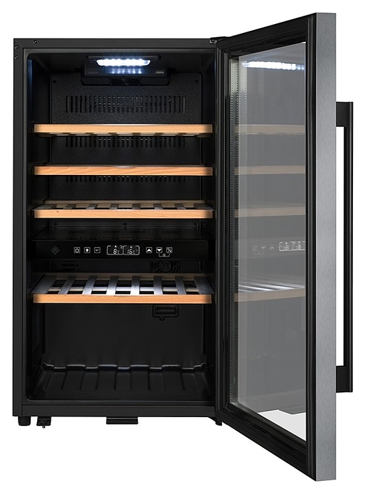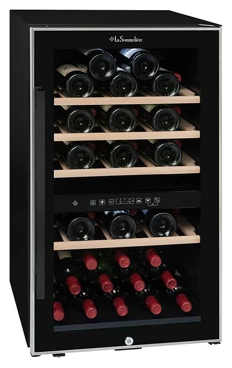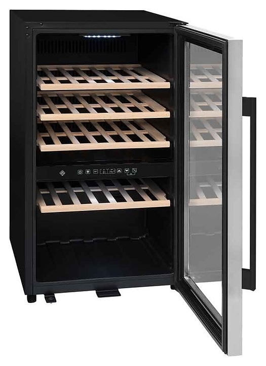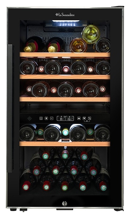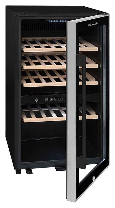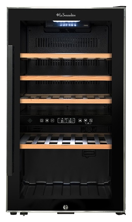 Винный шкаф La Sommeliere ECS51.2Z предназначен для хранения при оптимальных условиях и демонстрации бутилированного вина различных сортов в барах, ресторанах, специализированных магазинах, складских помещениях, а также домашних условиях. Модель оснащена холодильной камерой с 2 независимыми температурными зонами, правосторонней распашной дверью на внешних петлях, длинной вертикальной рукояткой, обзорным остеклением, кабелем питания с вилкой, расположенной внутри камеры панелью управления с сенсорными клавишами и жидкокристаллическим дисплеем с цифровыми и символьными сегментами индикации. Корпус и рама двери выполнены из металла с антикоррозийным покрытием черного цвета, торцевая окантовка рамы двери – из нержавеющей стали с сатинированной серебристой поверхностью, внутренняя облицовка камеры черного цвета, полки – из массива буковой древесины. В комплект поставки входят 4 выдвижные полки с направляющими для размещения бутылок, крепеж для рукоятки, ключ от замка, инструкция по эксплуатации, гарантийный талон и заводская упаковка. Особенности: