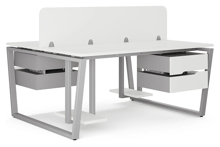 Офисный стол Кобор OTR/2-140/120 aluminum/premium на 2 рабочих места используется в офисных помещениях и кабинетах руководителей. Модель оснащена опорами в форме обратной трапеции. Каркас и опоры выполнены из металла, выкрашенного в цвет алюминиевый металлик (RAL9006), столешница – из ламинированной древесно-стружечной плиты (ЛДСП) цвета белый премиум (W1000 ST9). Дополнительные характеристики: