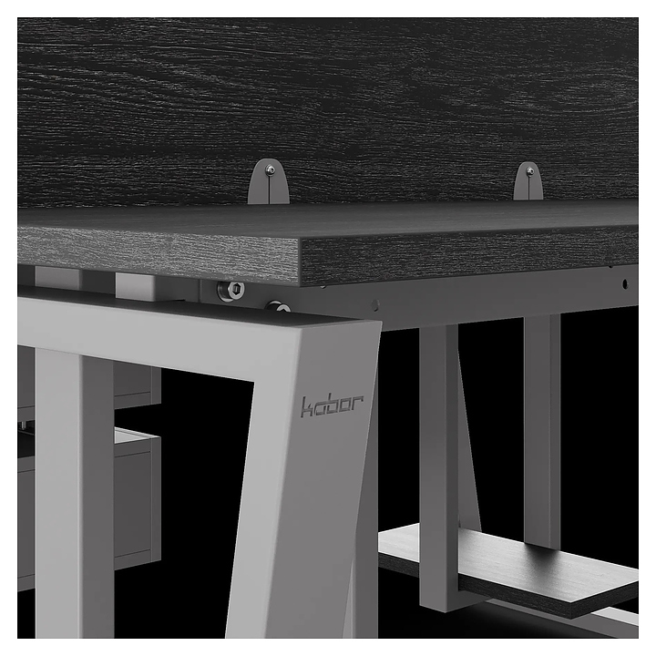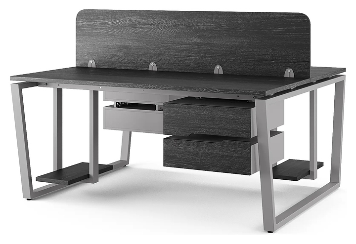 Офисный стол Кобор OTR/2-100/120 aluminum/glazed на 2 рабочих места используется в офисных помещениях и кабинетах руководителей. Модель оснащена опорами в форме обратной трапеции. Каркас и опоры выполнены из металла, выкрашенного в цвет алюминиевый металлик (RAL9006), столешница – из ламинированной древесно-стружечной плиты (ЛДСП) цвета черный дуб (H3178 ST37). Дополнительные характеристики: