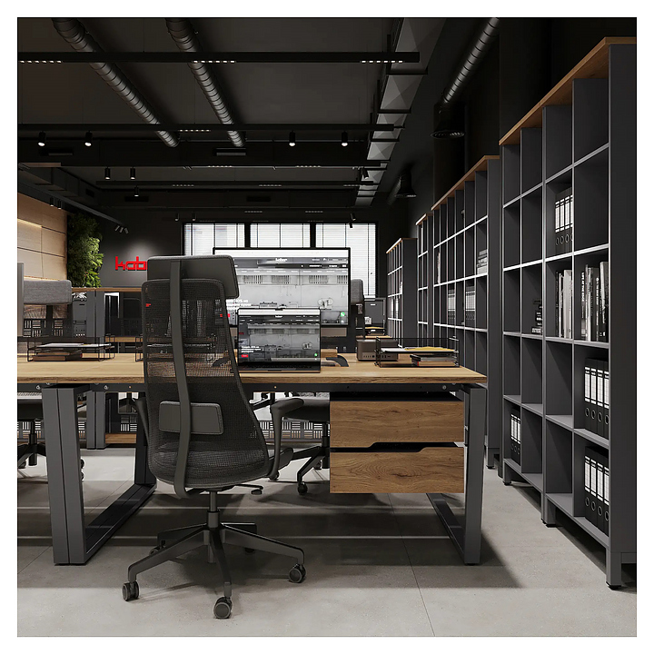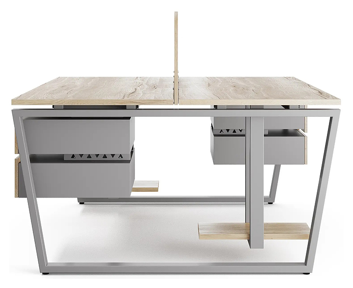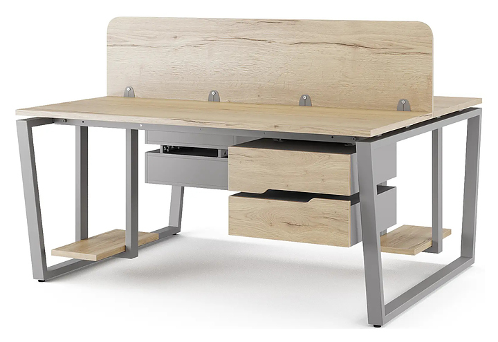 Офисный стол Кобор OTR/2-180/160 aluminum/natural на 2 рабочих места используется в офисных помещениях и кабинетах руководителей. Модель оснащена опорами в форме обратной трапеции. Каркас и опоры выполнены из металла, выкрашенного в цвет алюминиевый металлик (RAL9006), столешница – из ламинированной древесно-стружечной плиты (ЛДСП) цвета натуральный дуб (H1180 ST37). Дополнительные характеристики: