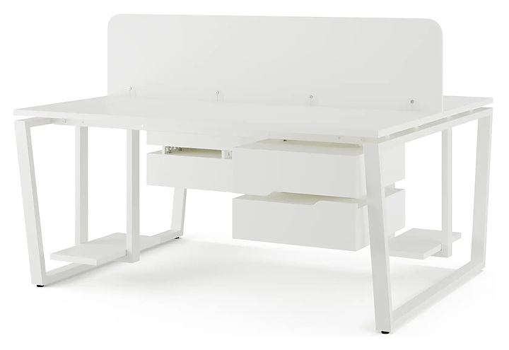 Офисный стол Кобор OTR/2-160/120 white/premium на 2 рабочих места используется в офисных помещениях и кабинетах руководителей. Модель оснащена опорами в форме обратной трапеции. Каркас и опоры выполнены из металла, выкрашенного в цвет белый муар (RAL9016), столешница – из ламинированной древесно-стружечной плиты (ЛДСП) цвета белый премиум (W1000 ST9). Дополнительные характеристики: