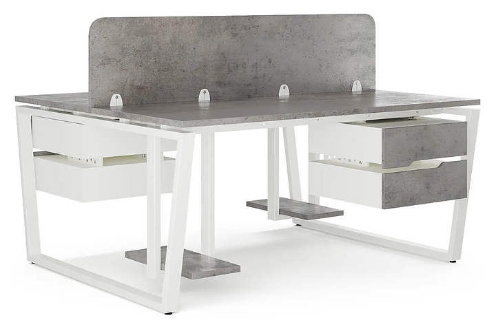 Офисный стол Кобор OTR/2-80/160 white/chicago на 2 рабочих места используется в офисных помещениях и кабинетах руководителей. Модель оснащена опорами в форме обратной трапеции. Каркас и опоры выполнены из металла, выкрашенного в цвет белый муар (RAL9016), столешница – из ламинированной древесно-стружечной плиты (ЛДСП) цвета бетон чикаго (F186 ST9). Дополнительные характеристики: