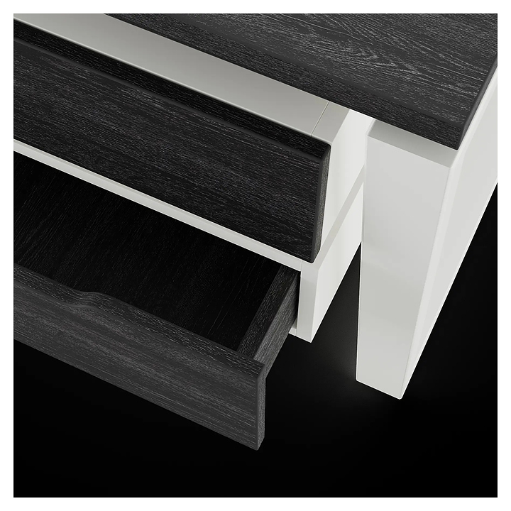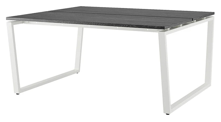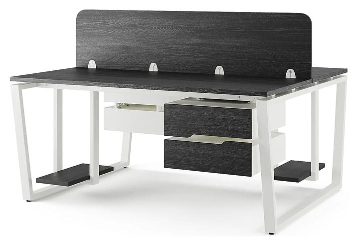 Офисный стол Кобор OTR/2-180/120 white/glazed на 2 рабочих места используется в офисных помещениях и кабинетах руководителей. Модель оснащена опорами в форме обратной трапеции. Каркас и опоры выполнены из металла, выкрашенного в цвет белый муар (RAL9016), столешница – из ламинированной древесно-стружечной плиты (ЛДСП) цвета черный дуб (H3178 ST37). Дополнительные характеристики: