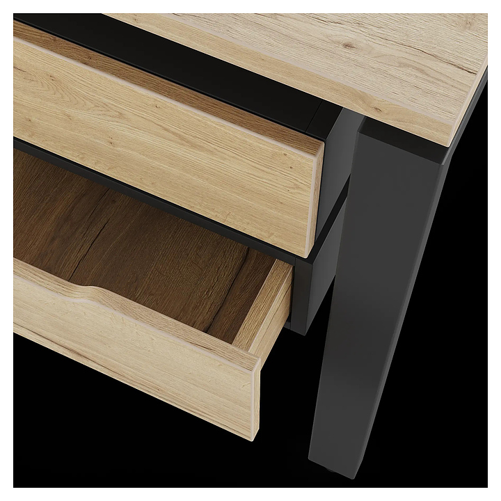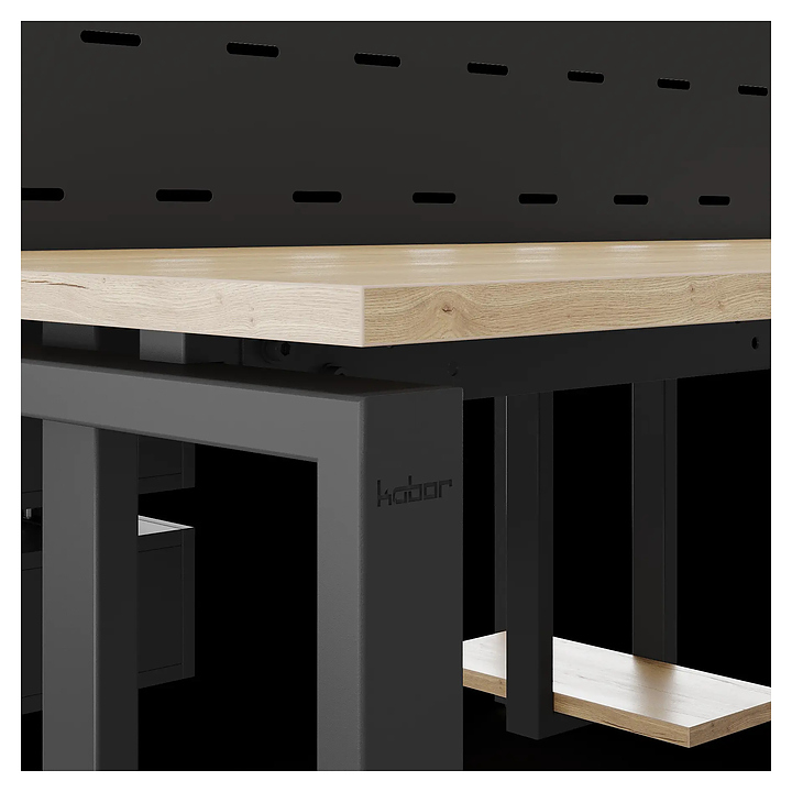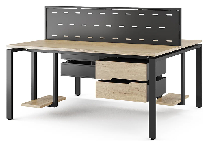Офисный стол Кобор P/2-180/160 black/natural на 2 рабочих места используется в офисных помещениях и кабинетах руководителей. Модель оснащена П-образными опорами. Каркас и опоры выполнены из металла, выкрашенного в цвет черный муар (RAL9005), столешница – из ламинированной древесно-стружечной плиты (ЛДСП) цвета натуральный дуб (H1180 ST37). Дополнительные характеристики: