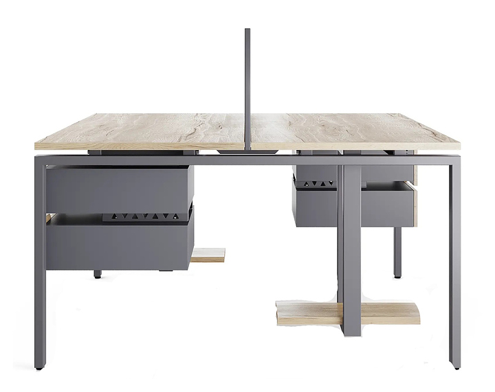 Офисный стол Кобор P/2-120/160 graphite/natural на 2 рабочих места используется в офисных помещениях и кабинетах руководителей. Модель оснащена П-образными опорами. Каркас и опоры выполнены из металла, выкрашенного в цвет графит муар (RAL7024), столешница из ламинированной древесно-стружечной плиты (ЛДСП) цвета дуб натуральный (H1180 ST37). Дополнительные характеристики: