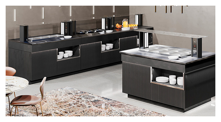 Шведский стол Finist ШСм1825 используется в гостиницах, на предприятиях общественного питания и торговли для кратковременного хранения в гоячем состоянии, демонстрации и раздачи путем самообслуживания вторых блюд. Модель оснащена подставкой, столешницей с подогреваемой ванной для размещения гастроемкостей и панелью управления. Столешница выполнена из высококачественной нержавеющей стали, облицовочные панели корпуса – из МДФ с покрытием дизайна «Сидней» черного цвета, верхняя полка – из просветленного стекла. Гастроемкости и посуда не входят в комплект поставки и приобретаются отдельно. Особенности: