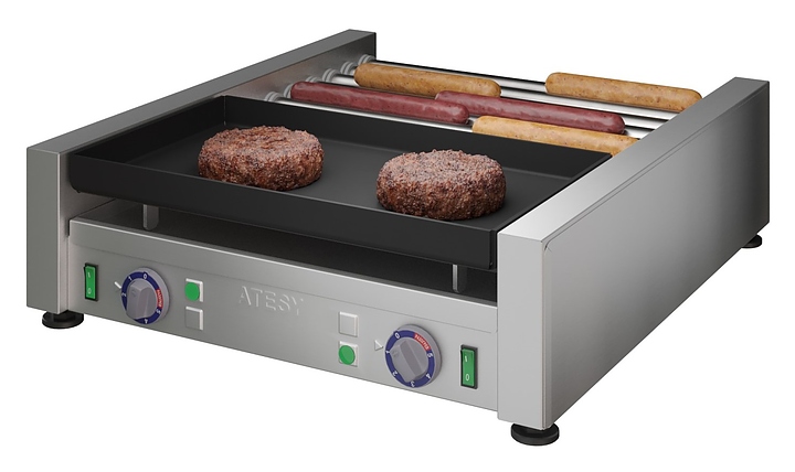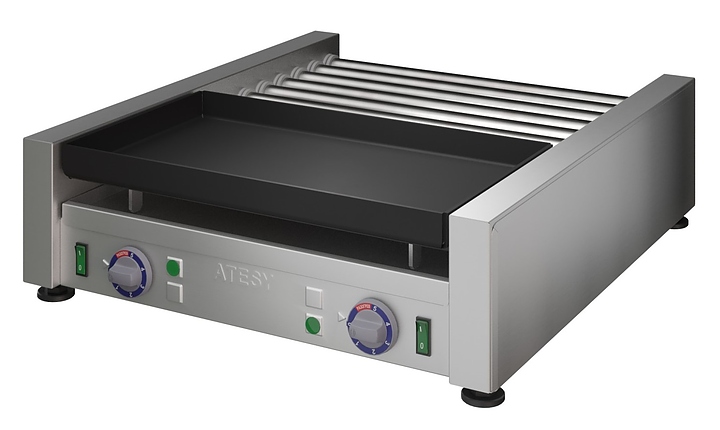 Комбинированный гриль ATESY Комбат ГКП-8Р.6Т-1П-450-02 используется на предприятиях общественного питания и торговли для приготовления различных типов продуктов: мяса, рыбы, овощей и т.д. Модель оснащена 1 жарочной поверхностью, 8 роликами и 6 ТЭНами. Корпус и ролики выполнены из пищевой нержавеющей стали, жарочная поверхность - из алюминиевого сплава с антипригарным покрытием. Особенности: