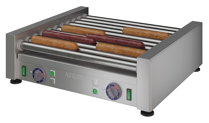 Роликовый гриль ATESY Комбат ГР-11Р-450-02 используется на предприятиях общественного питания и торговли для обжаривания сосисок, сарделек, а также мясных и рыбных батончиков цилиндрической формы. Модель оснащена терморегулятором и индикаторной лампой. Корпус и ролики выполнены из нержавеющей стали. Особенности: