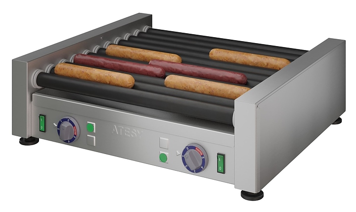 Роликовый гриль ATESY Комбат ГР-11Р-450-02-А используется на предприятиях общественного питания и торговли для обжаривания сосисок, сарделек, а также мясных и рыбных батончиков цилиндрической формы. Модель оснащена терморегулятором и индикаторной лампой. Корпус выполнен из нержавеющей стали, ролики - из черной нержавеющей стали с антипригарным покрытием. Особенности: