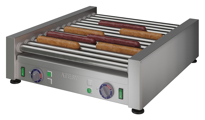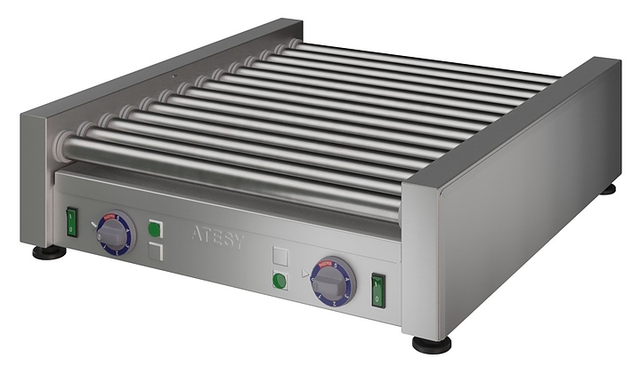 Роликовый гриль ATESY Комбат ГР-14Р-450-02 используется на предприятиях общественного питания и торговли для обжаривания сосисок, сарделек, а также мясных и рыбных батончиков цилиндрической формы. Модель оснащена терморегулятором и индикаторной лампой. Корпус и ролики выполнены из нержавеющей стали. Особенности: