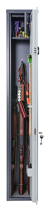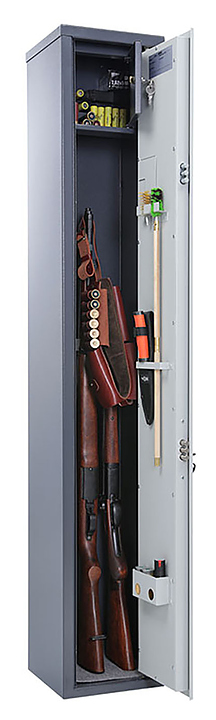 Сейф AIKO Беркут 3 EL предназначен для хранения огнестрельного оружия, патронов и принадлежностей. Модель оснащена 1 ключевым и 1 кодовым электронным замками в двери, запирающимся на ключ патронным отделением, ложементами для ружей и анкерными отверстиями для крепления к стене. Сейф соответствует требованиям МВД. Корпус имеет порошковое покрытие. Дополнительные характеристики: