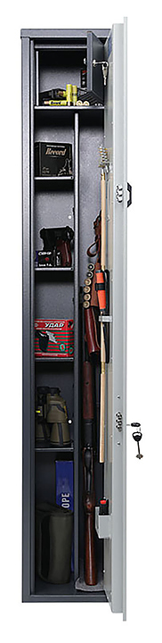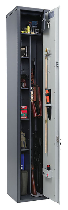 Сейф AIKO Беркут 165 EL предназначен для хранения огнестрельного оружия, патронов и принадлежностей. Модель оснащена 1 ключевым и 1 кодовым электронным замками в двери, запирающимся на ключ патронным отделением, 4 полками, ложементами для ружей и анкерными отверстиями для крепления к стене. Модель соответствует требованиям МВД. Корпус имеет порошковое покрытие. Дополнительные характеристики: