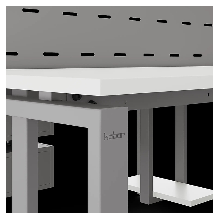 Офисный стол Кобор P/2-140/140 aluminum/premium на 2 рабочих места используется в офисных помещениях и кабинетах руководителей. Модель оснащена П-образными опорами. Каркас и опоры выполнены из металла, выкрашенного в цвет алюминиевый металлик (RAL9006), столешница – из ламинированной древесно-стружечной плиты (ЛДСП) цвета белый премиум (W1000 ST9). Дополнительные характеристики: