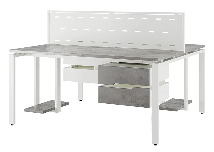 Офисный стол Кобор P/2-100/160 white/chicago используется в офисных помещениях и кабинетах руководителей. Модель оснащена П-образными опорами. Каркас выполнен из металла, выкрашенного в цвет белый муар (RAL9016), столешница – из ламинированной древесно-стружечной плиты (ЛДСП) цвета бетон чикаго (F186 ST9). Дополнительные характеристики: