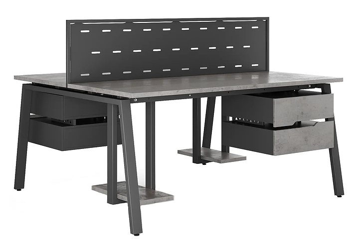 Офисный стол Кобор Стол A/2-120/160 black/chicago используется в офисных помещениях и кабинетах руководителей. Модель оснащена А-образными опорами. Каркас выполнен из металла, выкрашенного в цвет черный муар (RAL9005) , столешница – из ламинированной древесно-стружечной плиты (ЛДСП) цвета бетон чикаго (F186 SТ9). Дополнительные характеристики: