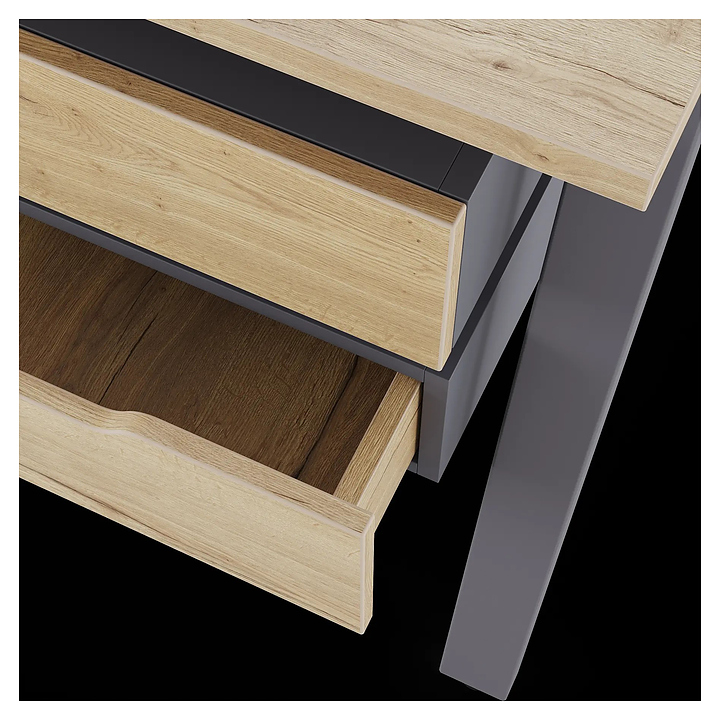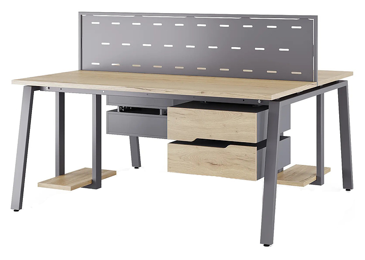 Офисный стол Кобор Стол A/2-120/160 graphite/natural используется в офисных помещениях и кабинетах руководителей. Модель оснащена А-образными опорами. Каркас выполнен из металла, выкрашенного в цвет графит муар (RAL7024), столешница – из ламинированной древесно-стружечной плиты (ЛДСП) цвета дуб натуральный (H1180 ST37). Дополнительные характеристики: