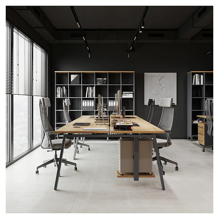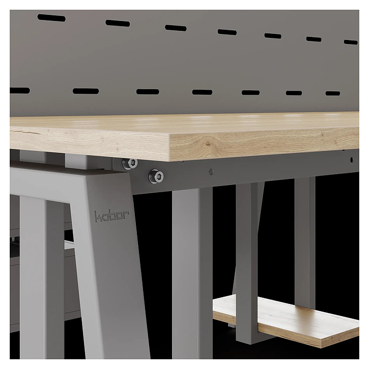 Офисный стол Кобор A/2-160/160 aluminum/natural используется в офисных помещениях и кабинетах руководителей. Модель оснащена А-образными опорами. Каркас выполнен из металла, выкрашенного в цвет алюминиевый металлик (RAL9006), столешница – из ламинированной древесно-стружечной плиты (ЛДСП) цвета дуб натуральный (H1180 ST37). Дополнительные характеристики: