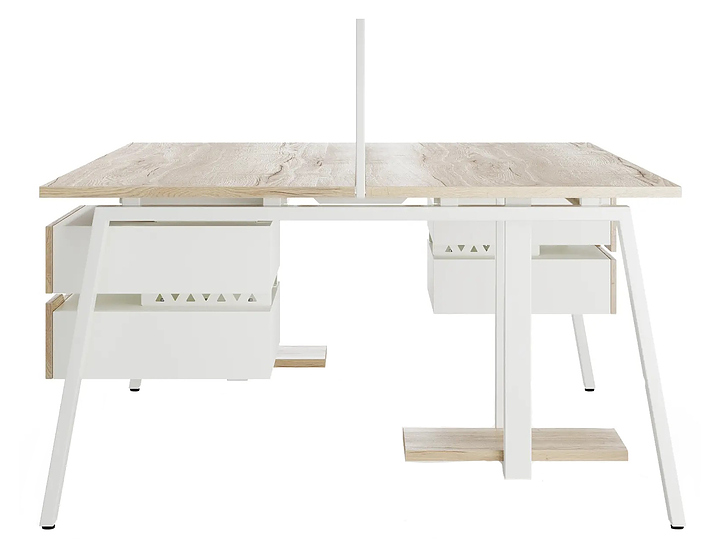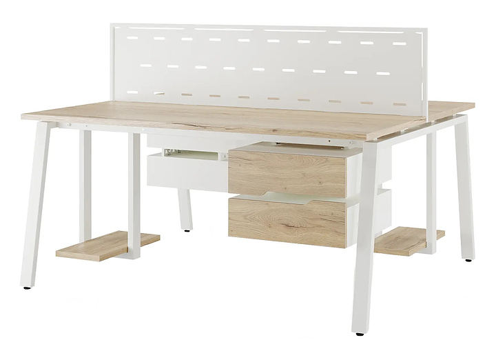 Офисный стол Кобор A/2-160/120 white/natural используется в офисных помещениях и кабинетах руководителей. Модель оснащена А-образными опорами. Каркас выполнен из металла, выкрашенного в цвет белый муар (RAL9016), столешница – из ламинированной древесно-стружечной плиты (ЛДСП) цвета дуб натуральный (H1180 ST37). Дополнительные характеристики: