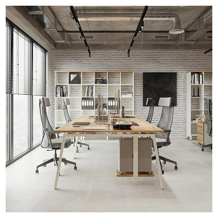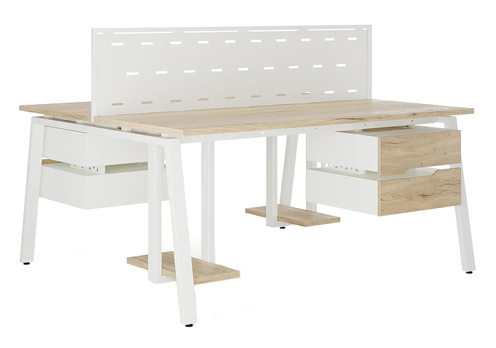 Офисный стол Кобор A/2-180/120 white/natural используется в офисных помещениях и кабинетах руководителей. Модель оснащена А-образными опорами. Каркас выполнен из металла, выкрашенного в цвет белый муар (RAL9016), столешница – из ламинированной древесно-стружечной плиты (ЛДСП) цвета дуб натуральный (H1180 ST37). Дополнительные характеристики:
