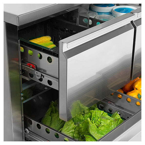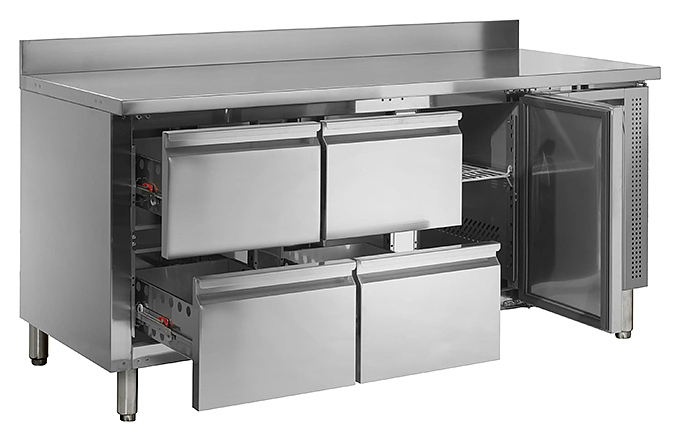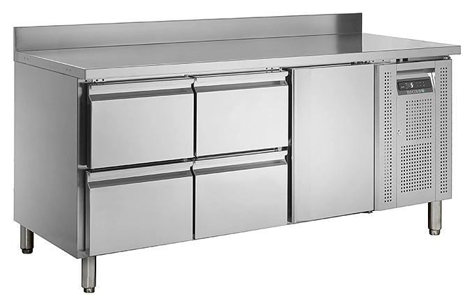 Холодильный стол TEFCOLD CK7340 состоит из функциональной рабочей поверхности для приготовления пищевых заготовок, полуфабрикатов, блюд, напитков и камеры для охлаждения и хранения продуктов. Модель оснащена встроенным холодильным агрегатом справа, термометром, 4 выдвижными ящиками, 1 распашной глухой дверью, 1 полкой и 4 регулируемыми ножками. Корпус, столешница и внутренняя отделка выполнены из высококачественной нержавеющей стали SS304. Особенности: