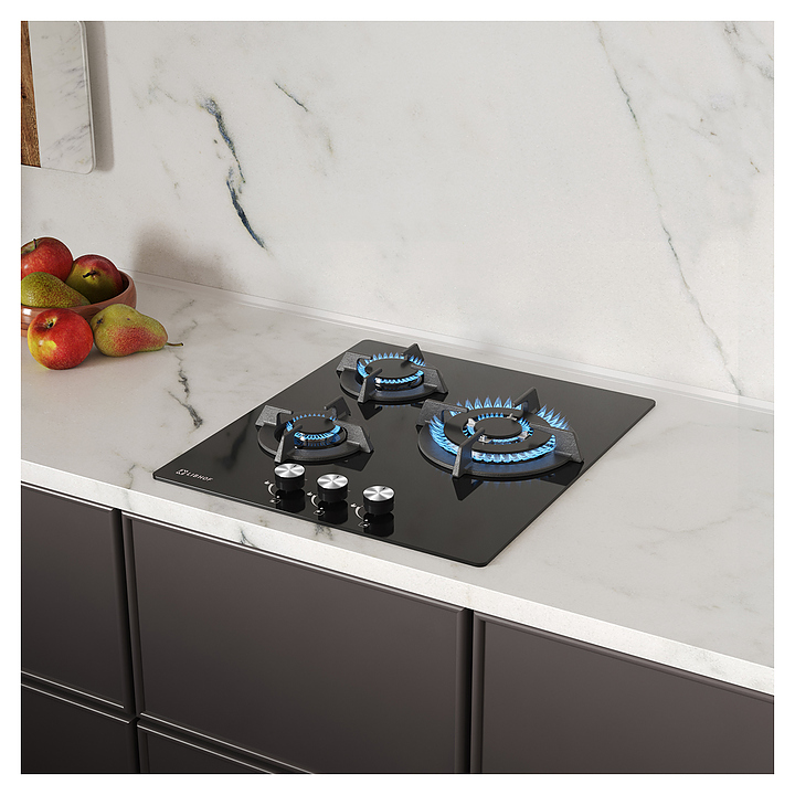 Газовая варочная панель Libhof IS-453 предназначена для приготовления большого ассортимента блюд в домашних условиях. Модель оснащена 3 конфорками различной мощности, 3 опорными решетками, кабелем питания и расположенной в правой части фронта механической панелью управления с 3 поворотными переключателями. Корпус выполнен из стали, рабочая поверхность – из устойчивого к механическим повреждениям закаленного стекла черного цвета, решетки – из чугуна, конфорки – из алюминия, крышки конфорок – из углеродистой стали, ручки переключатей цилиндрической формы – из термостойкого материала с серебристой поверхностью. В комплект поставки входят монтажные скобы с фиксирующими винтами, уплотнительная лента, колено с 2 прокладками для подключения газа, инструкция по эксплуатации, гарантийный талон и заводская упаковка. Особенности:
