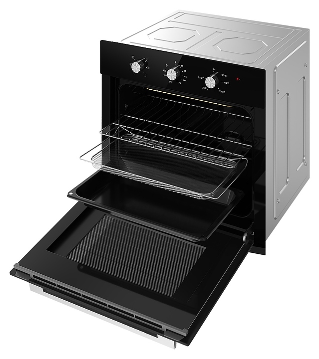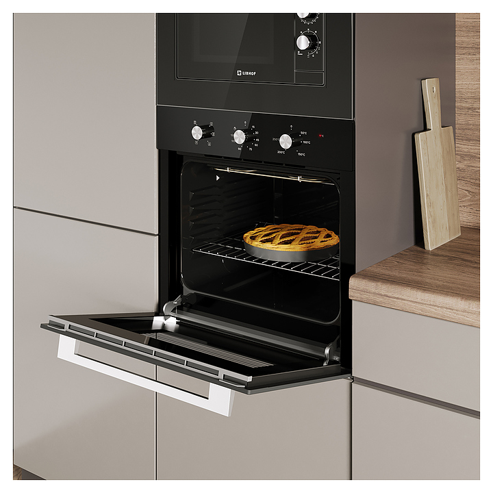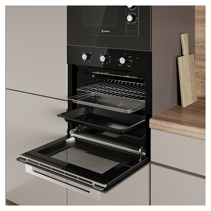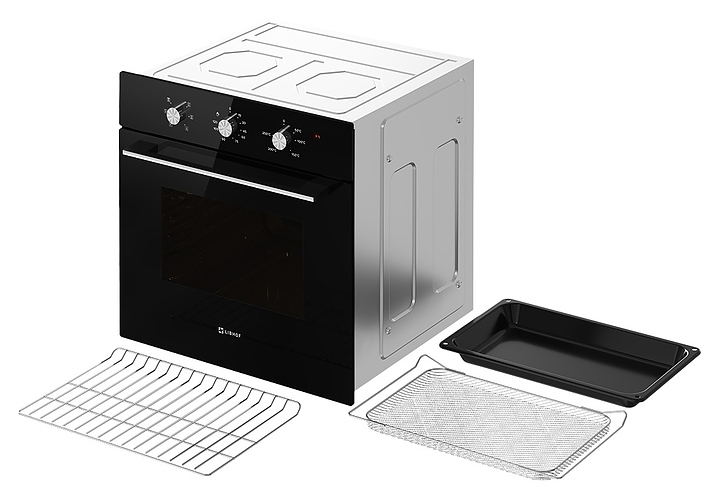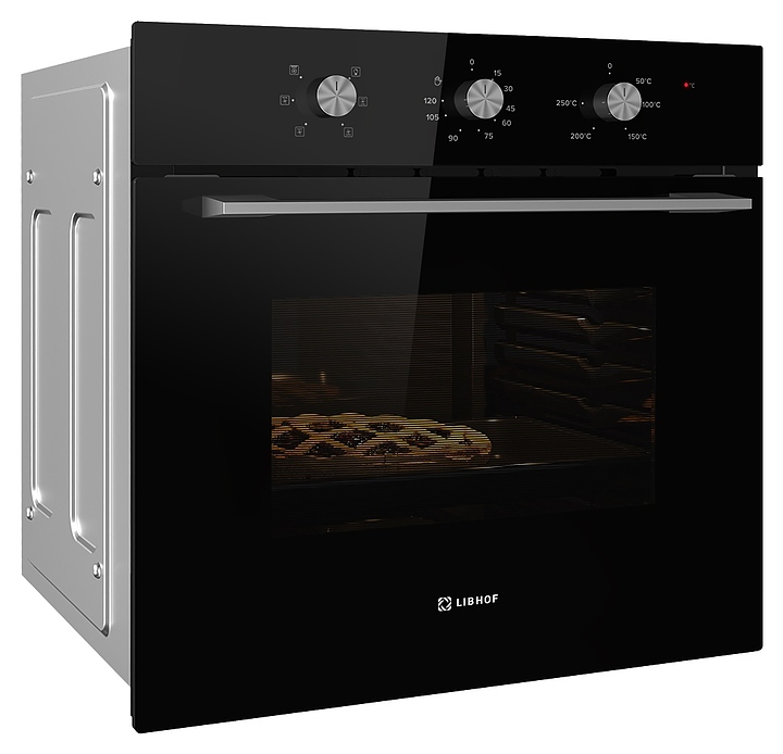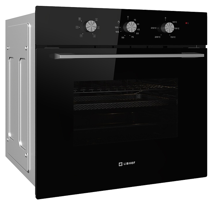 Встраивамый электрический духовой шкаф Libhof DSM-6063 black предназначен для приготовления большого ассортимента блюд в домашних условиях. Модель оснащена камерой с расположенным в задней стенке вентилятором, верхним и нижним нагревательными элементами, верхним грилем, 5 уровнями интегрированных в боковые стенки направляющих для противней, откидной дверью со смотровым окном, уплощенной горизонтальной рукояткой, кабелем питания и расположенной в верхней части фронта электромеханической панелью управления с 3 поворотными переключателями цилиндрической формы. Корпус выполнен из высококачественной стали с покрытием фронта черного цвета и полным остеклением фронтальных панелей без винтового крепежа прозрачным закаленным стеклом, фурнитура – из металла с матовой поверхностью цвета нержавеющей стали. Комплектация: