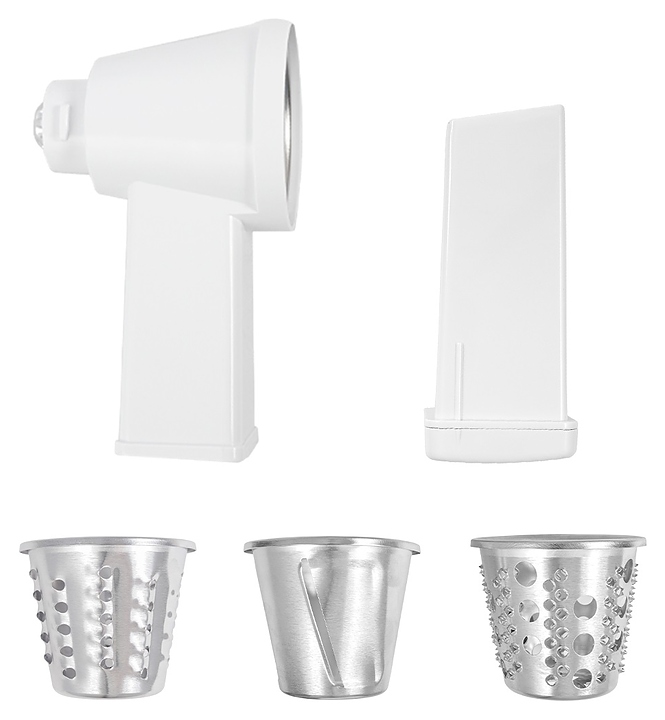 Насадка-терка Libhof MG-3500 используется совместно с мясорубкой MG-3500 для измельчения овощей и фруктов в домашних условиях. Модель состоит из рабочего блока, толкателя и 3 сменных насадок: крупной терки, мелкой терки и шинковки. Корпус рабочего блока и толкатель выполнены из прочного белого пластика, насадки – из металла. Характеристики: