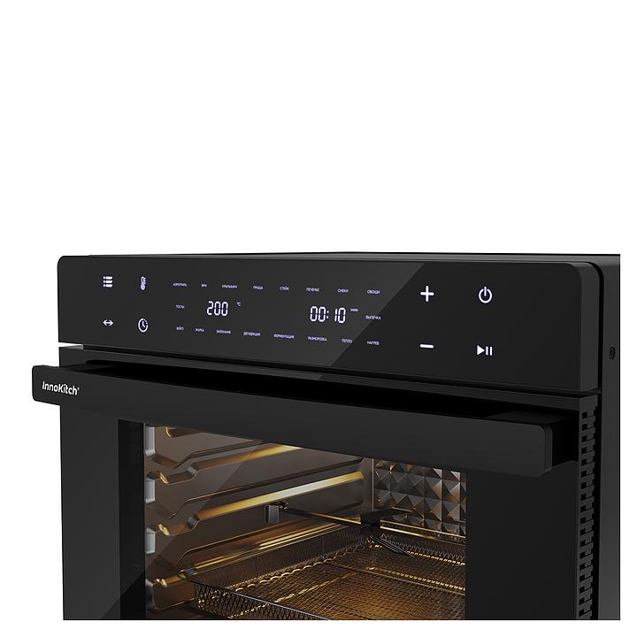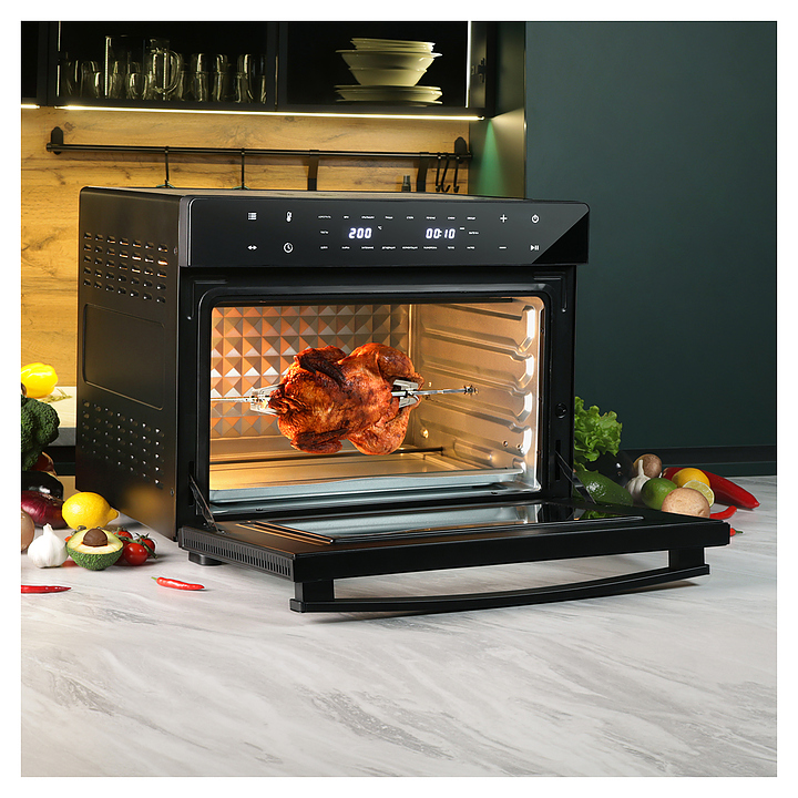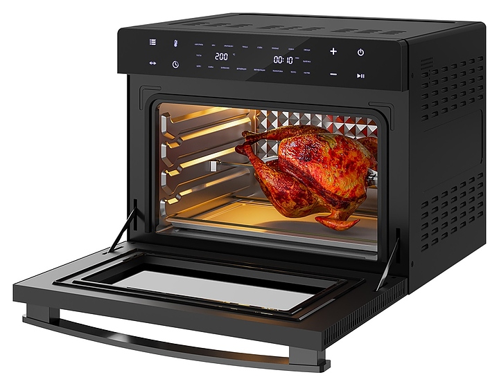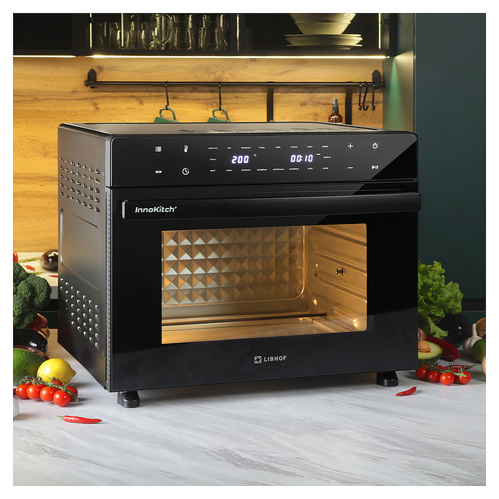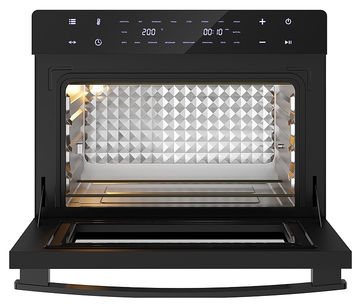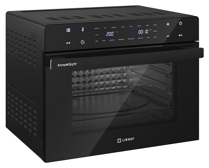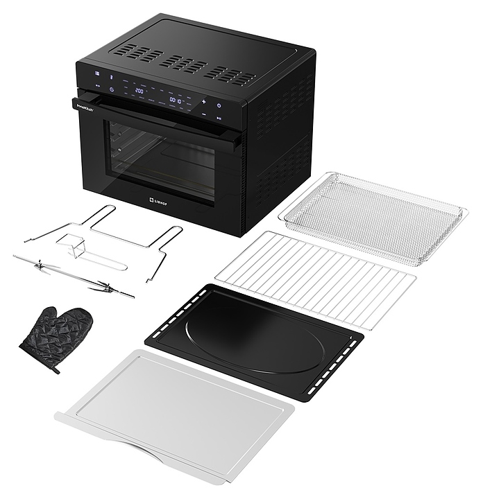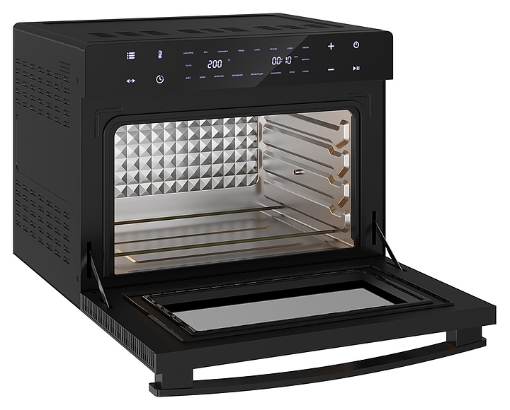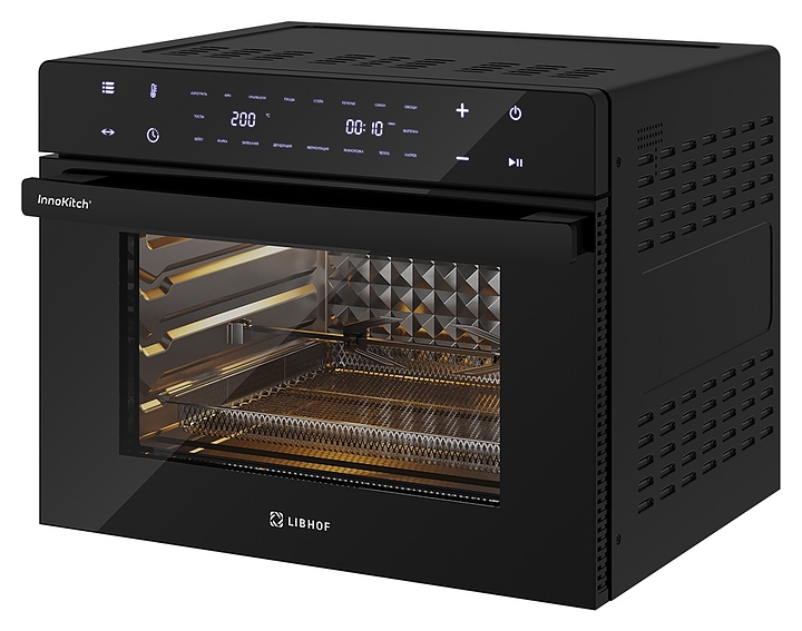 Электрический аэрогриль Libhof AFM-45 предназначен для приготовления различных блюд без использования масла или жира, а также жарки, запекания, выпекания кондитерских и хлебобулочных изделий, разогрева и размораживания пищевых продуктов в домашних условиях. Модель оснащена тэновым грилем, откидной дверью с дугообразной горизонтальной рукояткой и обзорным окном, расположенной в верхней части фронта электронной панелью управления с сенсорными функциональными клавишами и 2 цифровыми дисплеями индикации. Корпус выполнен из металла и пластика с черной поверхностью, дверь с полным фронтальным остеклением без винтового крепежа. Комплектация: