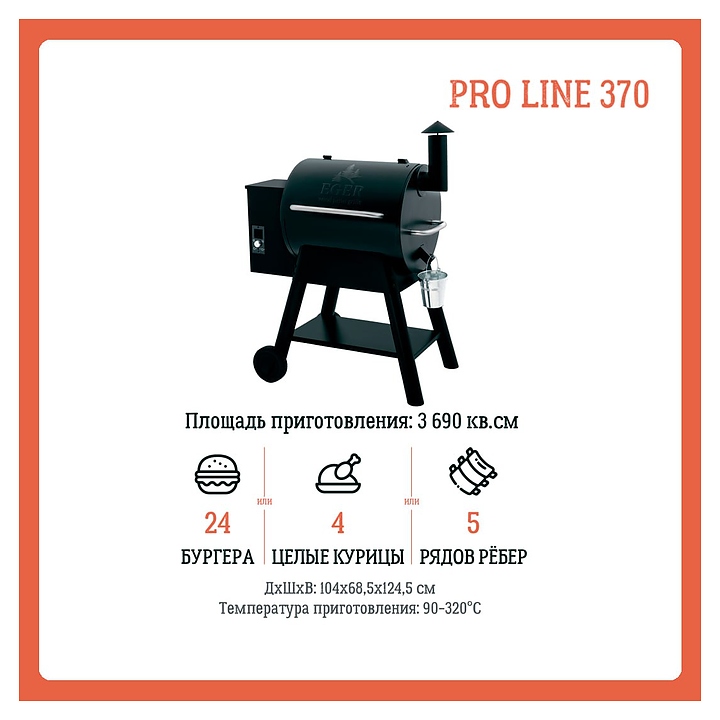 Пеллетный гриль EGER PRO Line 370 предназначен для жарики на барбекю-решетке, запекания и копчения на предприятиях общественного питания и торговли, в домашних условиях, на дачах и природе. Модель оснащена автоматизированной системой подачи пеллетов. Вы засыпаете гранулы, а цифровой механизм гриля постепенно отправляет их в топку, поддерживая заданную температуру. Корпус выполнен из высококачественной нержавеющей стали, устойчивый к атмосферным воздействиям. Особенности: