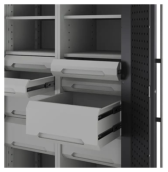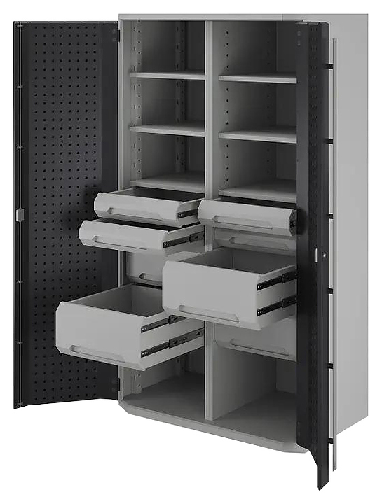 Шкаф Кобор Expert MC/3-100/60 6S.44B предназначен для хранения оснастки, приспособлений и инструмента на рабочих местах в мастерских, цехах и других производственных зонах. Модель оснащена 2 распашными дверьми с внутренней перфорацией для навешивания крючков и держателей, 6 полками, 8 ящиками и ригельным замком. Встроенная вертикальная перегородка делит шкаф на 2 изолированных отсека, что особенно удобно для совместного использования несколькими сотрудниками или разделения видов оснастки. Корпус выполнен из листовой стали с порошковой краской, которая отличается высокой устойчивостью к истиранию, влаге, моющим и смазочным веществам. Внимание! Информация о товарах, размещенная на сайте, не является публичной офертой, определяемой положениями Части 2 Статьи 437 Гражданского кодекса Российской Федерации. Производители вправе вносить изменения в технические характеристики, внешний вид и комплектацию товаров без предварительного уведомления. Уточняйте характеристики у наших менеджеров перед оформлением заказа. |