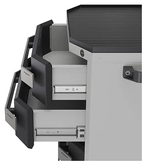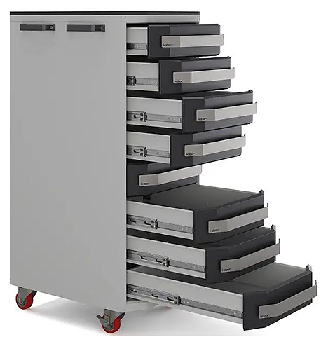 Тумба Кобор Expert TTL/3-50/64 80B предназначена для хранения и транспортировки к рабочему месту инструментов и приборов, необходимых для работы на сервисных и слесарных участках, в цехах заводов и на промышленных предприятиях. Модель оснащена ложементом с прорезиненными бортиками и 8 выдвижными ящиками, которые гарантируют комфортное использование и позволяют хранить необходимые инструменты и материалы на рабочем месте. Тумба имеет 4 поворотных колеса, обеспечивающих легкое перемещение по производственной зоне и стабильную фиксацию на месте. Корпус выполнен из металла с порошковым покрытием, устойчивым к механическим и химическим воздействиям. Особенности: