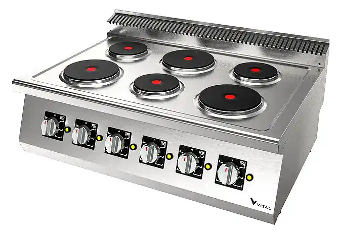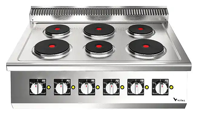 Электрическая плита VITAL EKO6030 серии 600 предназначена для приготовления различных блюд из мяса, птицы, рыбы и овощей в наплитной посуде на предприятиях общественного питания и торговли. Модель оснащена 6 круглыми конфорками, прессованным монолитным верхним столом и 6-ступенчатыми тепловыми переключателями. Закругленные края столешницы обеспечивают легкую чистку. Корпус выполнен из нержавеющей стали. Особенности: