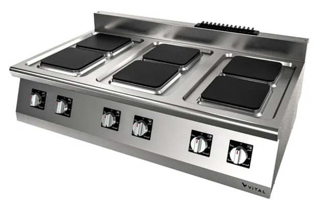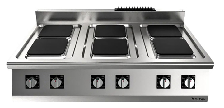 Электрическая плита VITAL PRO-EKO9030K серии 900 PRO предназначена для приготовления различных блюд из мяса, птицы, рыбы и овощей в наплитной посуде на предприятиях общественного питания и торговли. Модель оснащена 6 квадратными конфорками, прессованной монолитной столешницей и 6-ступенчатыми тепловыми переключателями. Плиту можно использовать на столешнице или с нижним шкафом. Закругленные края столешницы обеспечивают легкую чистку. Корпус выполнен из нержавеющей стали. Дополнительные характеристики: