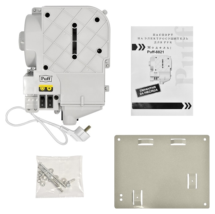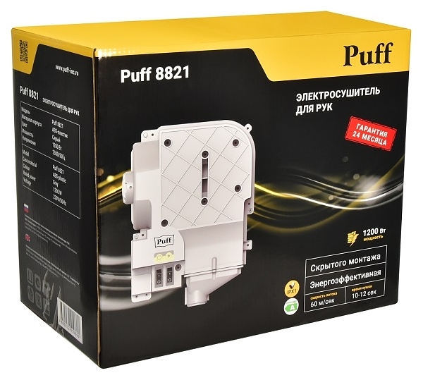 Электрическая сушилка Puff 8821 используется в санитарных узлах торговых центров, гостиниц, аэропортов, предприятий общественного питания и других местах массового пребывания для бесконтактной гигиеничной сушки рук. Модель оснащена электронагревателем, инфракрасным датчиком приближения, кабелем питания и выключателями колыбельного типа. Корпус выполнен из ударопрочного АБС-пластика серого цвета, упаковка – картонная коробка. Комплектация: