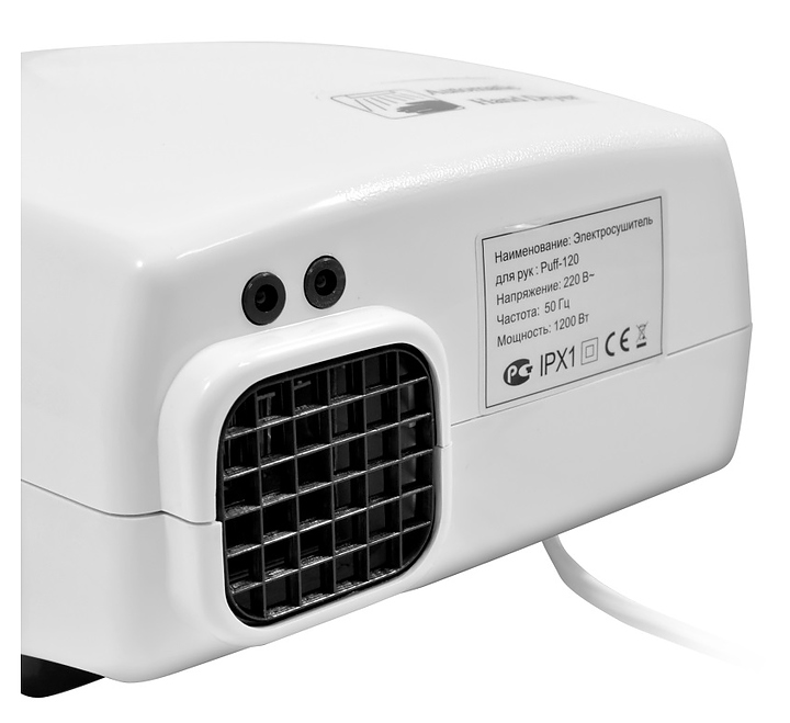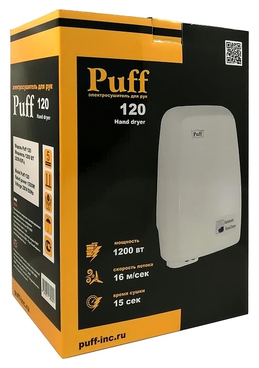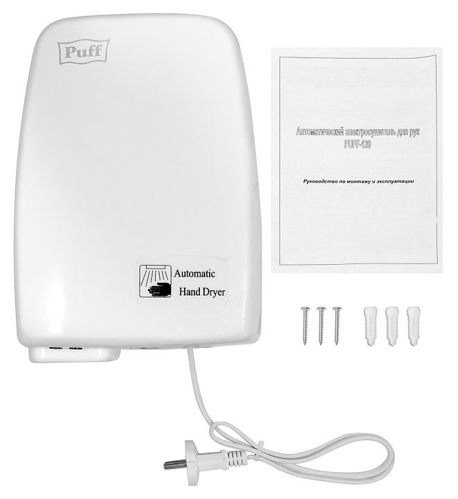 Электрическая сушилка Puff 120 используется в санитарных узлах торговых центров, гостиниц, аэропортов, предприятий общественного питания и других местах массового пребывания для бесконтактной гигиеничной сушки рук. Модель оснащена электронагревателем, инфракрасным датчиком приближения и кабелем питания. Вертикально ориентированный корпус обтекаемой формы выполнен из ударопрочного АБС-пластика с белой глянцевой поверхностью, упаковка – картонная коробка. Комплектация: