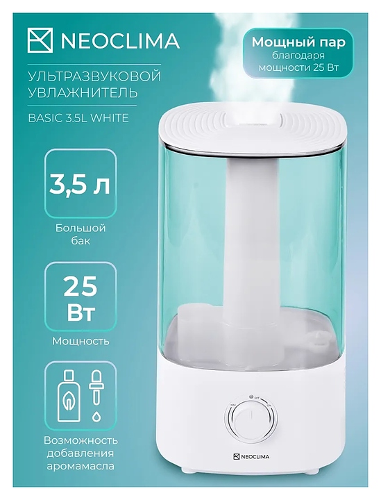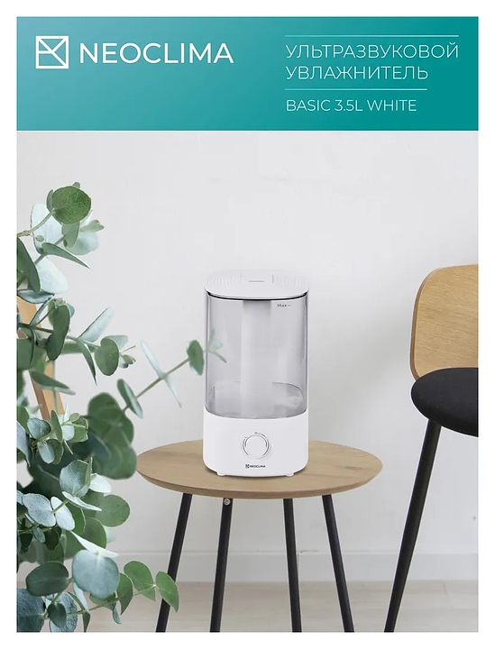 Увлажнитель воздуха ультразвуковой Neoclima BASIC 3.5L White создаст комфортный микроклимат в доме, квартире и офисе, поддерживая оптимальный уровень влажности в помещении во время отопительного сезона и жаркого лета. Распыляет воду на ультра-мелкие частицы 1-5 мкм, используя принцип ультразвукового высокочастотного колебания, и рассеивает водяной туман в воздух через пневматическое устройство для обеспечения равномерного увлажнения воздуха в помещении без капель и налета на мебели и технике. Корпус выполнен из пластика. Особенности: